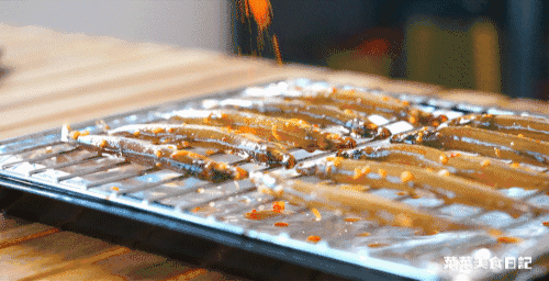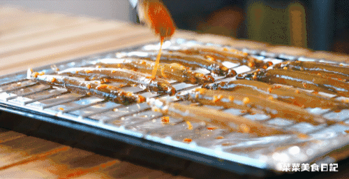 3.腌好的多春鱼铺在烤架上,再刷一层腌鱼剩下的酱汁。