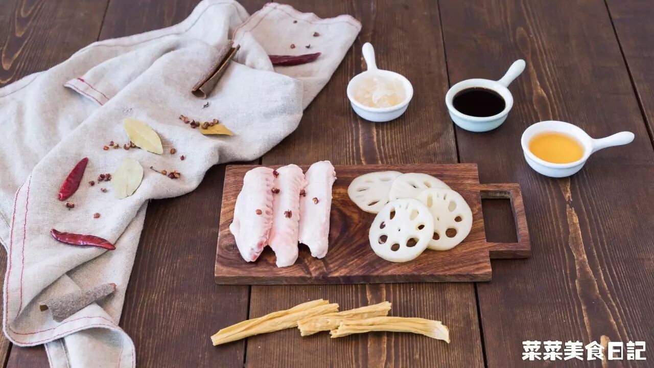 1.鸭翅洗净;莲藕切片;腐竹用冷水提前泡发。
