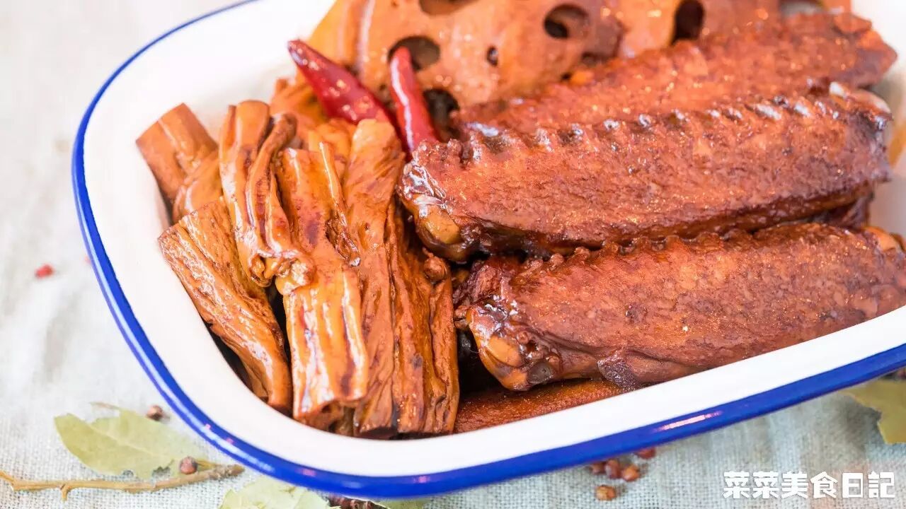 4.先荤后素:先卤鸭翅,大火烧开后,转小火煮至汁水快收干,才倒入莲藕和腐竹,再小火煮至汁水完全收干即可。