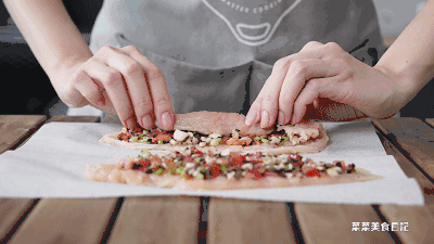 2.橄榄泥与橄榄油混合均匀,番茄沫、香芹沫、蟹味菇沫搅拌均匀,抹在鸡肉上,不要抹到最边缘,留出约1厘米的周边空白部分,撒入少量盐(橄榄泥自身带有盐味)