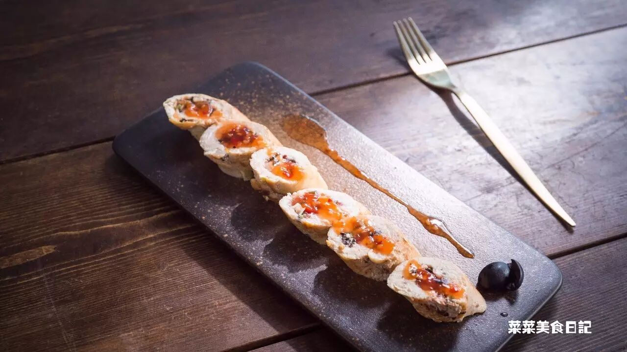 我用鸡胸肉和橄榄泥卷实,再煎到表皮略黄,冷藏后切开,一道西班牙风味的小吃—橄榄鸡肉卷就做好了。