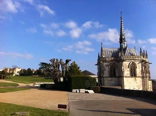 此时的雷奥纳多已是垂暮之年。他一生最后三个寒暑,是在卢瓦尔边的昂布瓦斯度过的。这里,沿河谷耸起一段峭壁,上面是一座法国文艺复兴风格的城堡主楼。就在这条法国历史上的“国王谷”,修建过大量混合了哥特及意大利款式的宫堡,特别是瓦鲁瓦王朝期间。山顶庭园中,是小巧典雅的圣于贝尔礼拜堂,里面有一座大理石墓,正是埋葬大师的地方。