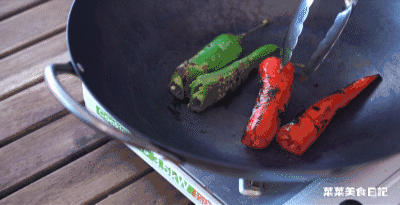 辣椒和茄子都是在火上烤过的,茄子是吸油的蔬菜,上烤架一烤,反把水分逼了出来,皮焦肉嫩。