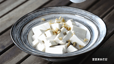 1.豆腐切块放进碗里,上面撒上榨菜粒。