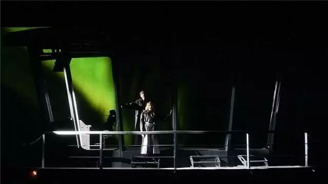 但是,剧中之人的穿着打扮是当代人,已然在无形之中“消解“了原作的精神主旨,加上设计者有意地将舞台灯光调置昏暗朦胧,以此想用来强化与预示将要发生的爱情悲剧,但最终出现的效果,依然是适得其反的,因为作为观者的我,并没有将注意力投放在人物身上了,而是被这个“奇异”的舞台装置所“吸引”,它分散了我的注意力,给我的印象则又是怪兮兮的,不知所以,它与人物及剧情因此发生了第一层次的奇怪的移位。