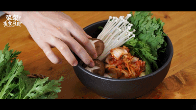 2.将大蒜、葱段、泡菜、豆腐、金针菇、蘑菇、茼蒿放入石锅中