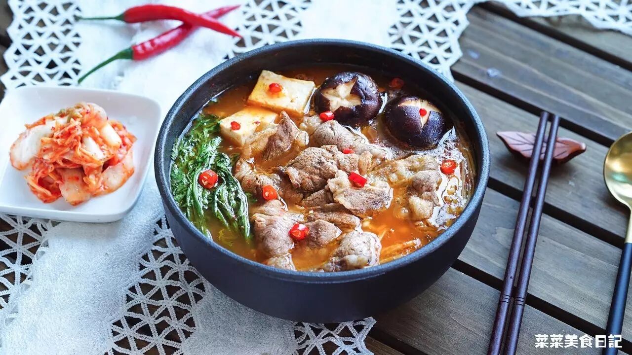 食材丰盛的泡菜肥牛锅,还在炉上咕噜咕噜的煮着时,香味就四处窜开了。