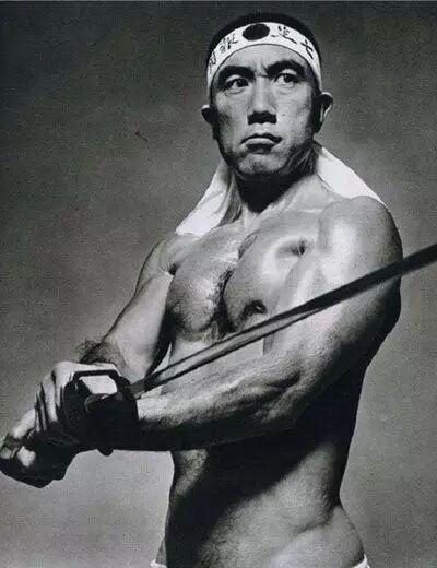 另一张没见过的照片吓了一跳。一惊之下,不禁仔细审视了起来。他半裸,双手紧握武士刀,仰拍,头上扎白头巾,用毛笔写着四个字“七生报国”。面容凶狠,怒气冲冲,脸很大,方形,嘴角下瘪。手臂和胸口的毛很长,细细的密密麻麻,如黑色雨林。东方人很少有这样浓密细长的毛发。胸肌因过度用力而充血挤压,腹部结实微凸,一侧的人鱼线像被指甲划过,在皮肤上留下弧度若隐若现的一弯,露出来的一侧臀部则高如马臀……像野蛮人,又像军国主义者。