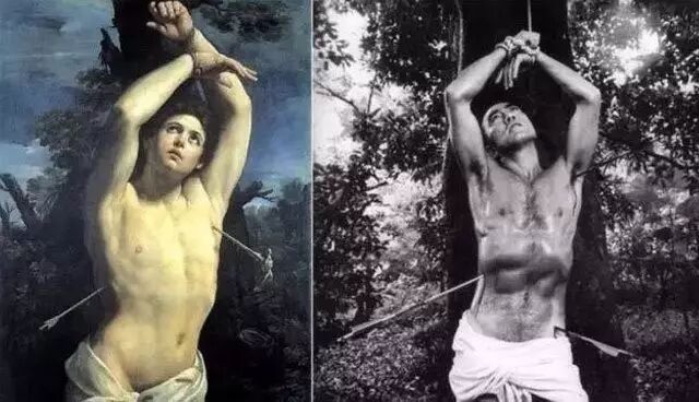 仿《圣塞巴斯蒂安殉教图》的照片很早前就见过。三岛由纪夫腰缠白粗布,像甘地。光滑遒劲的两肋,一左一右各有一箭,使人想起张爱玲在《少帅》中形容男人在性爱的终点,如同“背上中了一箭”。三岛腋窝也有一支箭,扎在黑色茂密的腋毛丛中。脸仰着,眉心紧锁,两只眼睛似乎在叩问苍穹——标准的屈原式“天问”。