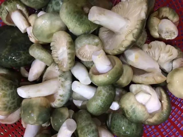 接上来,青头菌出现在农贸市场上。这种菌子,外表带有青色豹纹,做法特别多。既可以把菌柄和肉剁碎做成馅“酿”入菌帽之中;也可以菌柄在上菌帽在下小火慢烤,受热过程中汤汁溢到菌帽里,形成一个菌子汤包,先喝汤,再吃肉,舒坦。