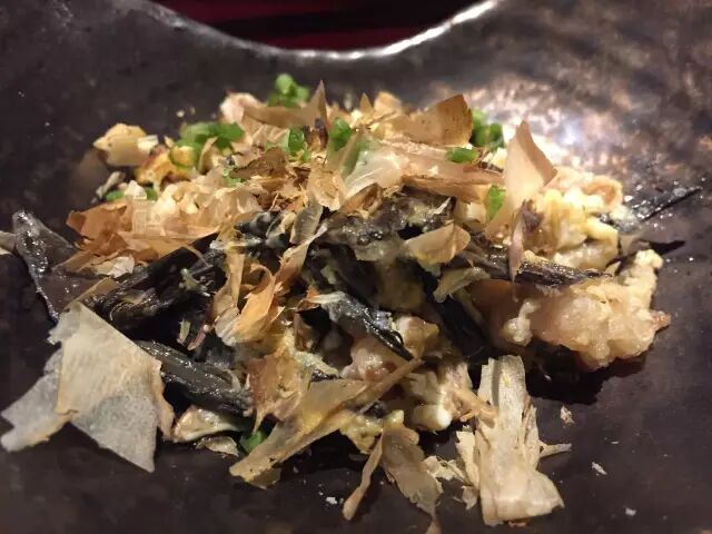比如说这道干巴菌冲绳炒,还没端上来就闻到一阵猛烈的香气。菌子裹着蛋液,只需要一点点鲣鱼片和青葱,吃起来感觉嘴里在发光。
