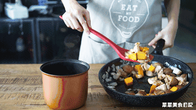 煮到软硬适中的米饭油光发亮,看起来粒粒分明,吃进嘴里却一点不觉得油腻,反倒因为沾染了南瓜的香和蘑菇的鲜,变得愈发可口。