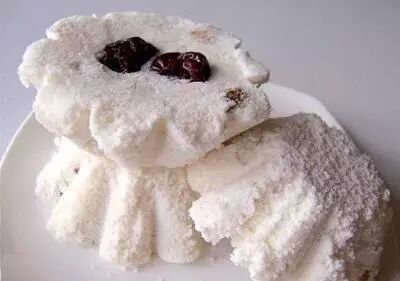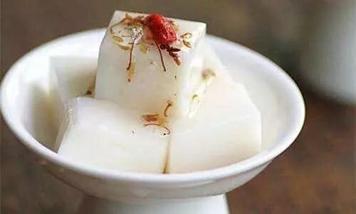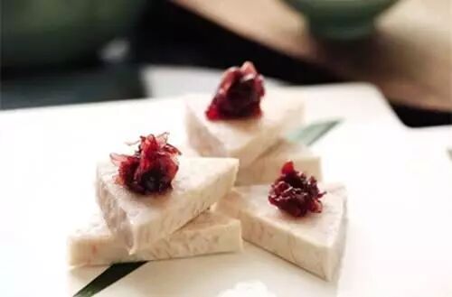 桂花糕是已有300多年历史,是用糯米粉、糖和蜜桂花为原料制作而成的美味糕点,中国特色传统小吃。满地铺桂的季节,一壶浊酒,一盘点心,会有一种“山寺月中寻桂子”的意境。 3.杏仁豆腐