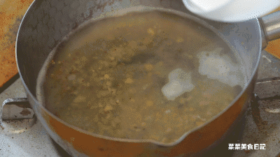 2.锅中下水,放入冰糖小火煮至融化,碎栗子和桂花一起煮到水开