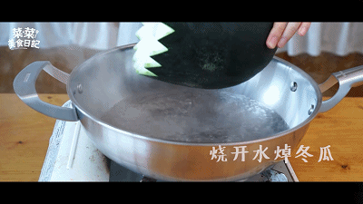 4.整个冬瓜放入沸水中煮几分钟,去除生腥味