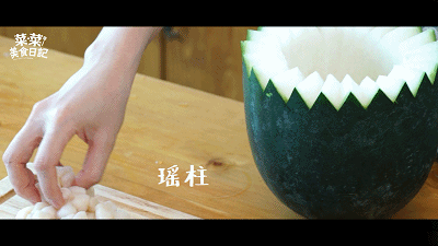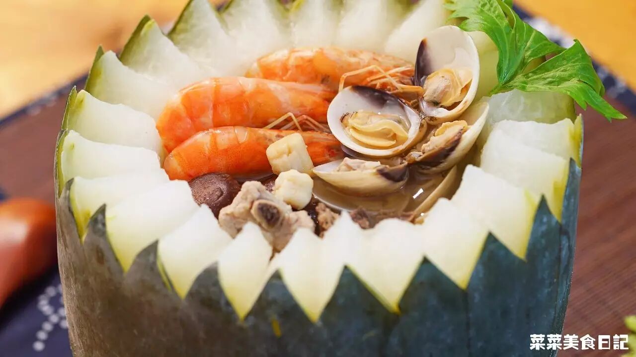 选老冬瓜尾部做容器,再铺上瑶柱、火腿、香菇、虾米等至鲜之物,冬瓜利尿祛湿解暑,味道又鲜美,用来煲汤是一绝。