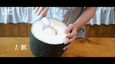2.取冬瓜尾部,掏出瓜瓤,并挖出部分冬瓜肉,尽量扩大容量