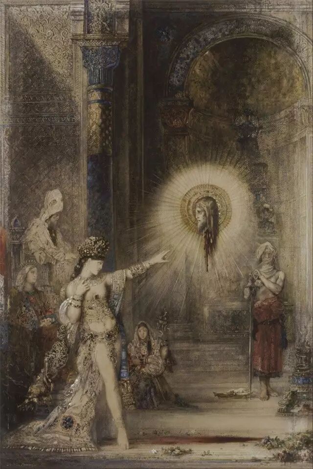 《幽灵》可以对比莫罗的《在希律王面前跳舞的莎乐美》(一八七五)和《花园里的莎乐美》(一八七八)来看。那两幅还是比较“写实”的——我的意思是接近于对《圣经》里相关记载的“视觉再现”。虽然这也是一种想象,但毕竟与画出“幽灵出现”的情景有所区别。在《在希律王面前跳舞的莎乐美》里,莎乐美虽然是在跳舞,但两眼下垂,梦游一般,不过是自我陶醉而已;在《在希律王面前跳舞的莎乐美》里,莎乐美捧着约翰的头,但那只是个死人的头,即便是她的战利品,也没有什么意思了。