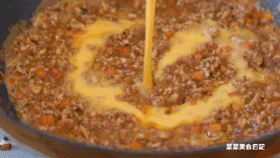2.锅中倒油,下咸蛋小火炒到起泡,下胡萝卜丁和肉末炒熟,倒入蛋液搅拌均匀