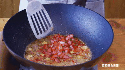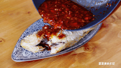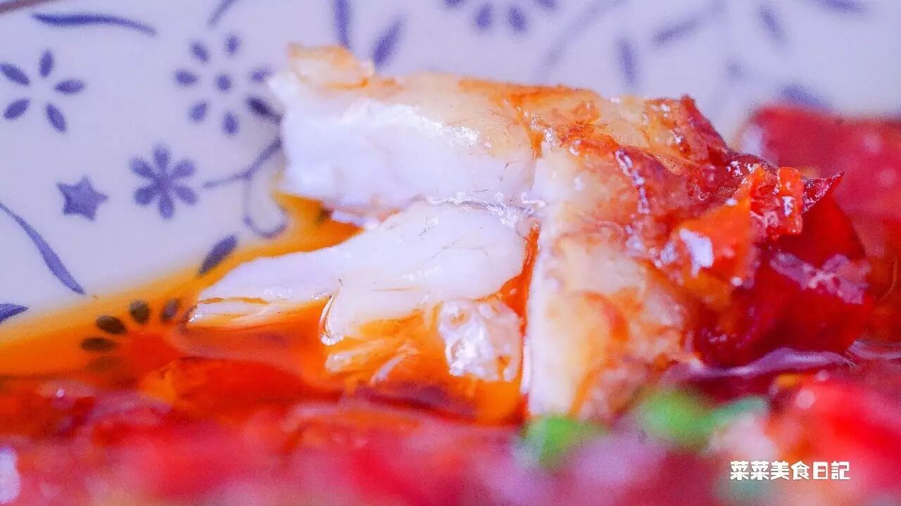 剁椒炒得喷香,佐以西红柿提鲜提色,看起来就忍不住冒口水。最后淋到鱼身上,酥香的外壳瞬间吸收了酱汁,香辣过瘾!
