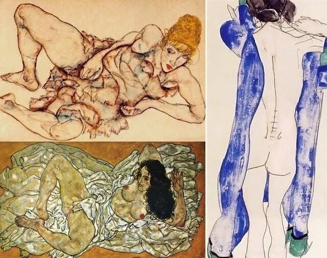 克里姆特的人体,大多是如他的著名画作《金衣女人》一样衣着华丽的贵妇人;席勒的人体,则大多是裸体,有女人,也有男人。克里姆特的人体,是局部写实中整体带有浓郁的装饰风格,雍容华贵,典雅而现代;席勒的人体,则是性器官赤裸裸的,张扬的,怪异的,狰狞的,甚至是村野的、丑陋的、焦灼的。