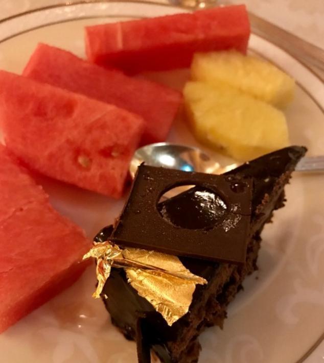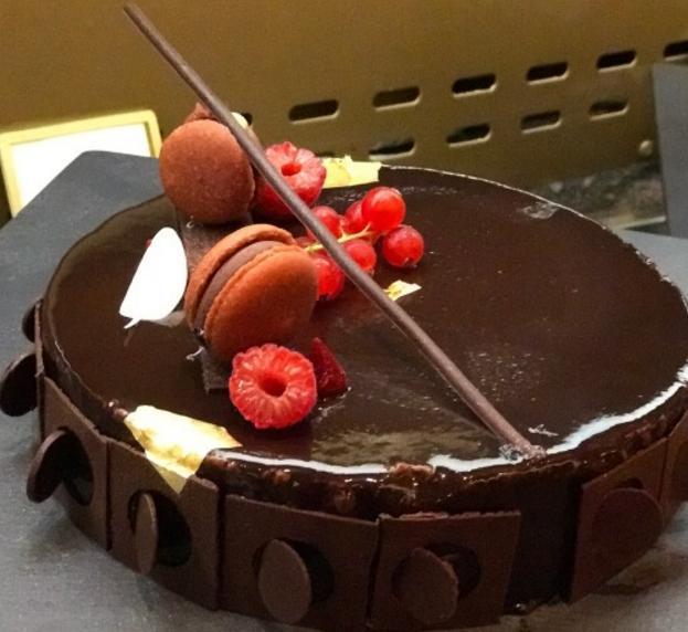 巧克力蛋糕味道很好,上面还有马卡龙可以吃,但是同样的,这样一个巧克力蛋糕的热量也相当惊人。