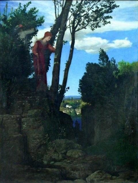 勃克林的确发挥了更多的想象力,但就像所绘《美女阿纳狄奥墨涅》(一八七二)、《戏浪》(一八八三)、《女水神的游戏》(一八八六)和《鼠疫》(一八九八)等一样,虽为奇思异想——单就奇思异想的程度而言超过了莫罗——但却稍显直露,余味不多。倒是《奥德修斯和卡吕普索》(一八八三)境界较为深远:卡吕普索坐在画面一隅,回望背对自己在礁石上站成一个剪影的奥德修斯,满脸无奈与惆怅。然而画家在这里恰恰相对克制了想象力。