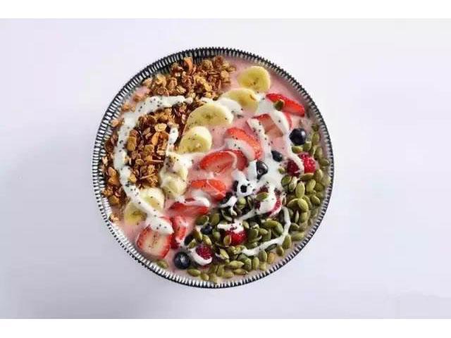 草莓、香蕉、火龙果、木瓜和希腊酸奶果昔搭配上鲜草莓、芒果、奇异籽和格兰诺麦片,端上来的时候带着一丝凉意,这天气要是再冷点儿,可就有点儿伤胃了,作为轻体之选,也和适合减肥的人代餐食用。