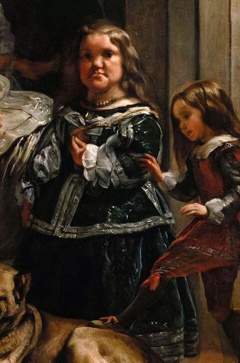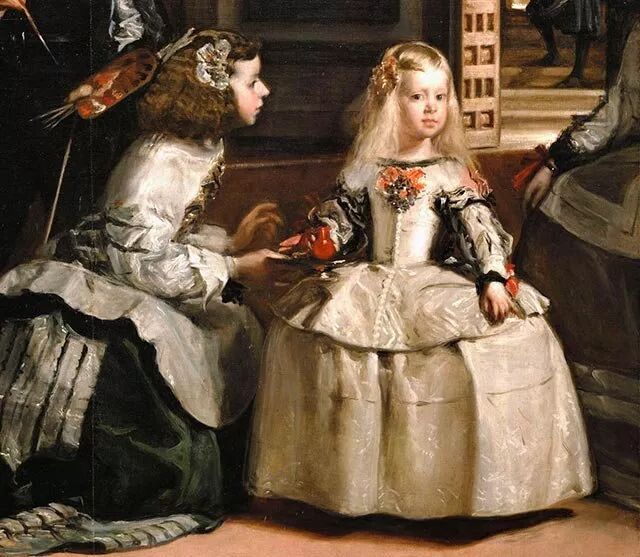 那么站在画家侧方的是谁?当然是居于画面中心的那个金发的小公主玛格丽特·特蕾莎,她才是委拉斯凯兹正在描绘的模特儿。不过请注意,也许是嫌做模特儿太无聊,小公主并没有待在画家设定的那个位置上,她想走动,乃至凑到跟前去看看画家的进度。一位宫娥挡在了她与画家之间,她右手端着盛着茶点的盘子,左手带有明显的劝慰之意,如同她的眼神和表情。她的肢体语言还暗示了一个常常被人误解的情形,玛格丽特不是作画现场的闯入者,宫娥不会随意找些东西来打发主人,那些茶点早就预先为公主准备了。