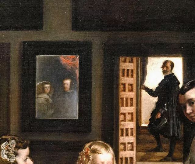 然而事实是,从透视的技巧来看,镜子的位置相当诡异。假如画中的几个人物把目光投向画外的国王夫妇,那么无论这对夫妇身处何处,都不大可能完整地映照在那面镜子中。而任何和夫妇站在同一视点的观者也都不会认为,镜子是画面的中心位置。