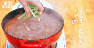 7.加入芹菜的茎、迷迭香和香叶,慢炖1小时