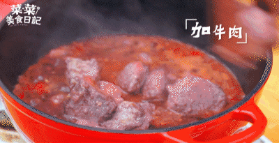 6.放入煎过的牛肉,倒入高汤,大火煮开后转小火