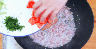 4.调中火,用煎过牛肉的油炒香蒜末,倒入洋葱炒软后,加蕃茄丁炒至出汁