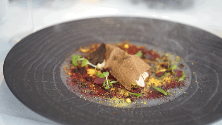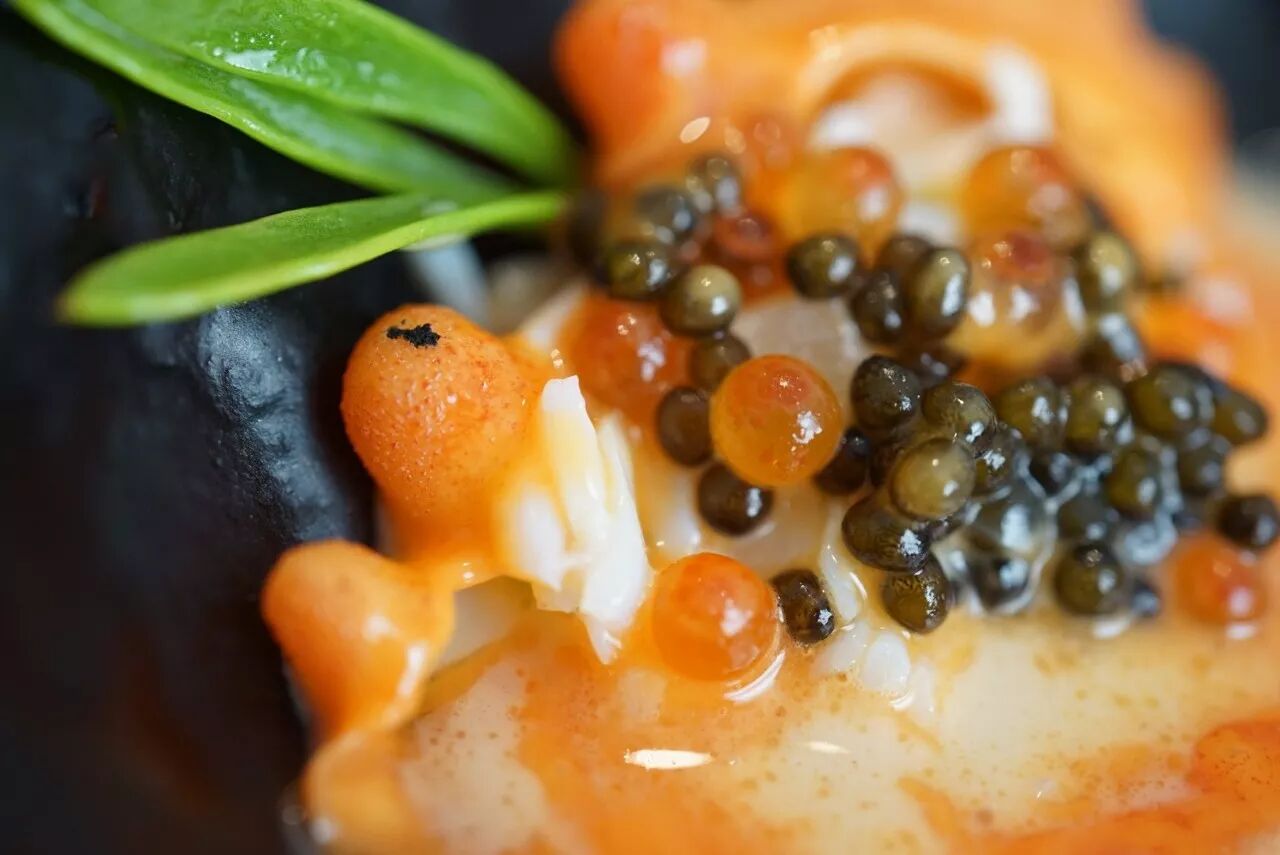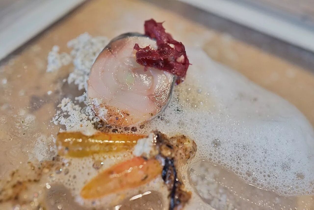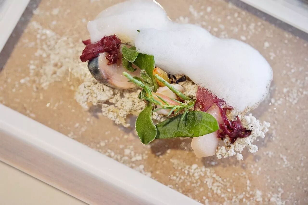 沙子能吃,实际上是木薯、油炸面包屑、炸碎的小鳗鱼,鱼肝油和鲍鱼油的混合物;红色的是某种海藻;泡沫是用贝类的汁水打成,故意保留了海水的咸腥味。跟这些比起来,生鱼片吃起来好像……刚从海水里捞出来一样!