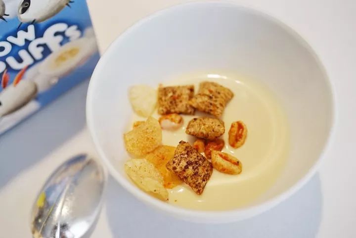 一份英式早餐味儿的谷物麦片,酥酥脆脆的谷物吃起来是煎培根、烤面包、土豆味的,还有一些冻干番茄碎,拌着香浓顺滑的松露鸡蛋慕斯一起吃掉。