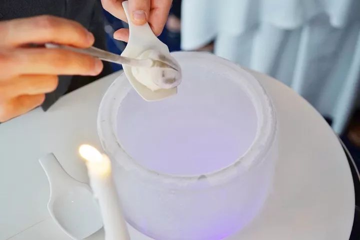 来看看两道开胃小菜。第一道液氮冰淇淋开胃酒。青柠汁混合一点点无味伏特加,蛋白霜一样轻盈的口感,放进嘴巴里立刻融化,口腔变得异常清新。