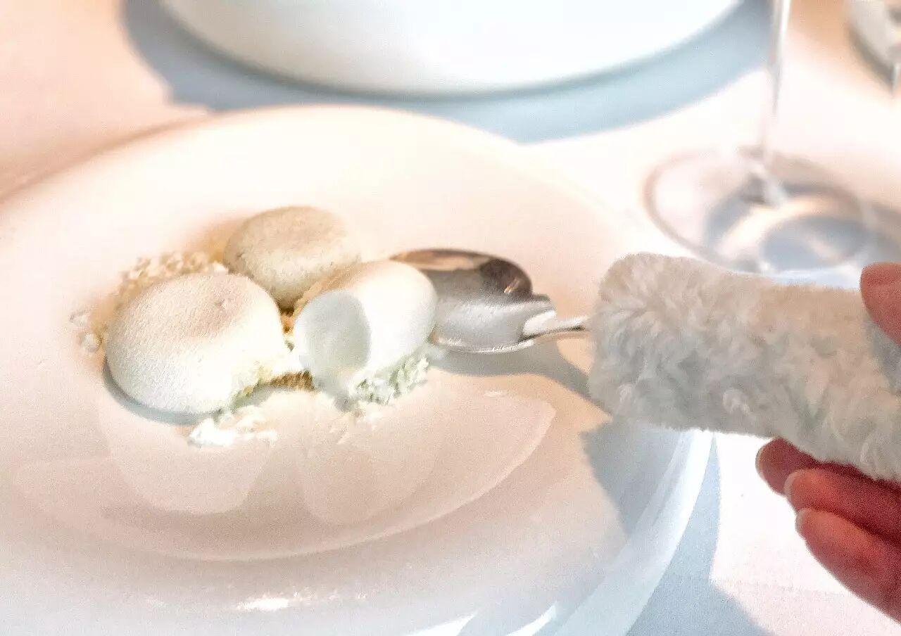 看着这个枕头,我们吃掉了这盘牛奶白巧克力还有一点点橙花香气的棉花糖,还是很空气的口感,这道甜点,叫做数绵羊。勺子用绵软的羊毛包裹着,感觉自己像个大宝宝,昏昏欲睡
