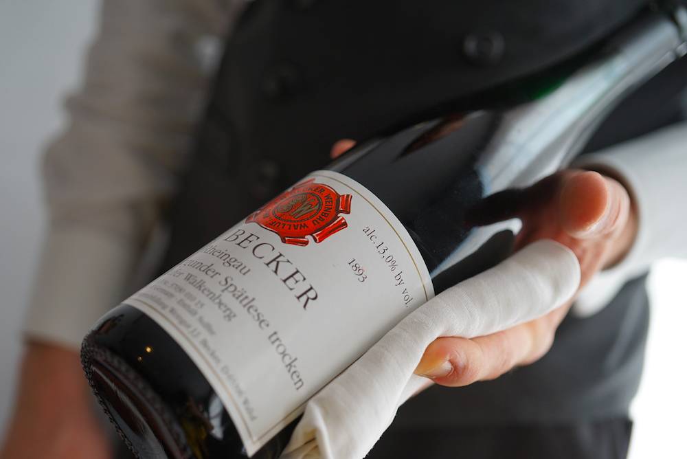 • 吃完整个套餐需要四小时,建议配支酒。酒单非常长,有整整一本。当天点了一支雷司令大家分。闻佳老师又单点了一杯黑皮诺配她的牛肉。