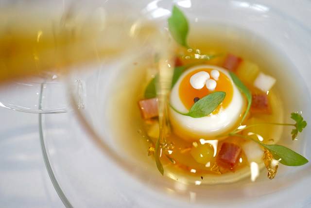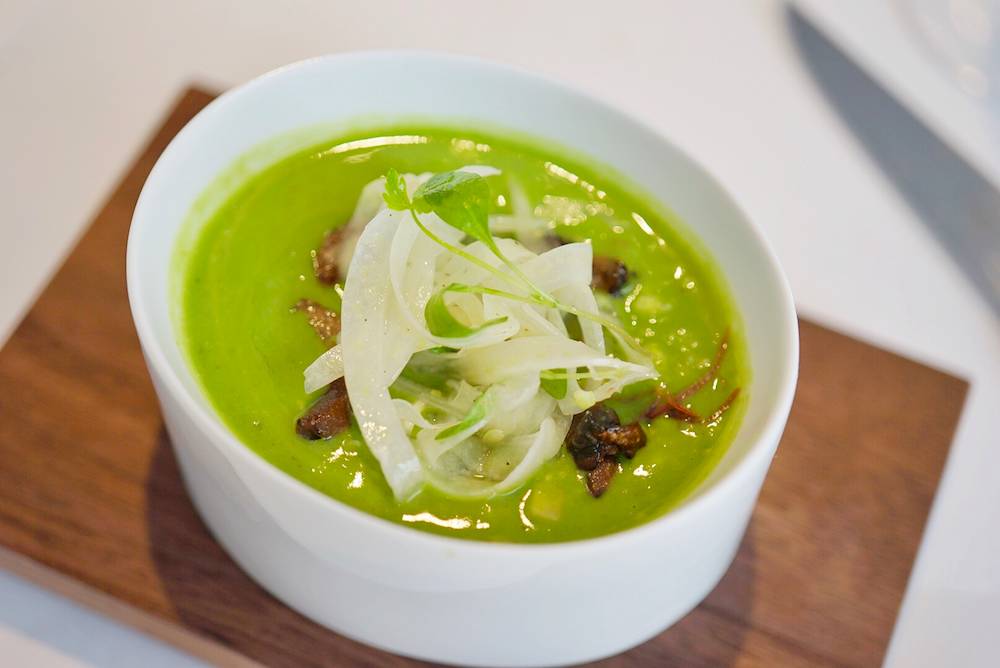 开胃冷汤,芥末味的冰淇淋,浇上蔬菜汤汁,好像清晨阳光照耀的小池塘。