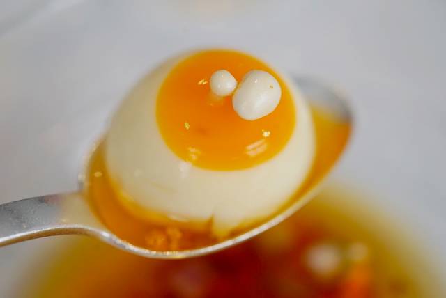 相比海滩,还是这道螃蟹汤更可爱。热汤浇下去后,小螃蟹橘黄色的蟹壳会融化,露出一肚子晶莹剔透的鱼子。蟹壳融化的那一瞬间,忍不住「哇」了出来,真美