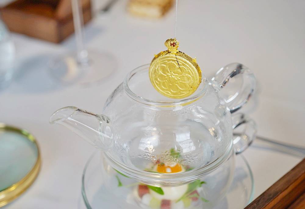 还记得爱丽丝里有一幕是爱丽丝、疯帽子和三月兔在树下喝茶,疯帽子的怀表出了问题,三月兔就把怀表在茶里浸了一下,这道菜就完美重现了这个场景。