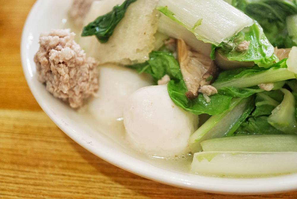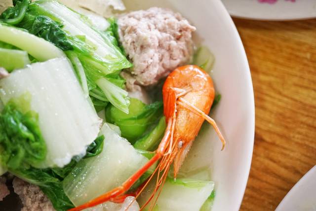 这盘炒三鲜,是非常地道的杭州家常菜。新鲜做的猪肉丸子,甜嫩多汁的杭州小白菜,还有江浙常见的水发肉皮,再放几只小河虾,清淡下饭: