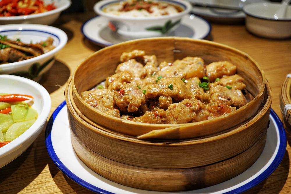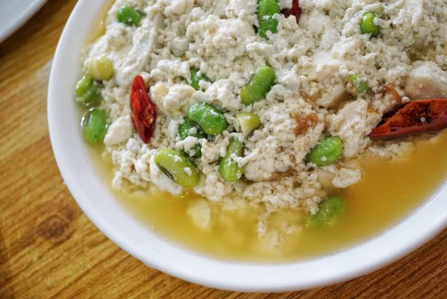稍微清淡些的,是臭豆腐蒸毛豆。这是臭豆腐里的「清新」风格,嫩嫩的,还不错: