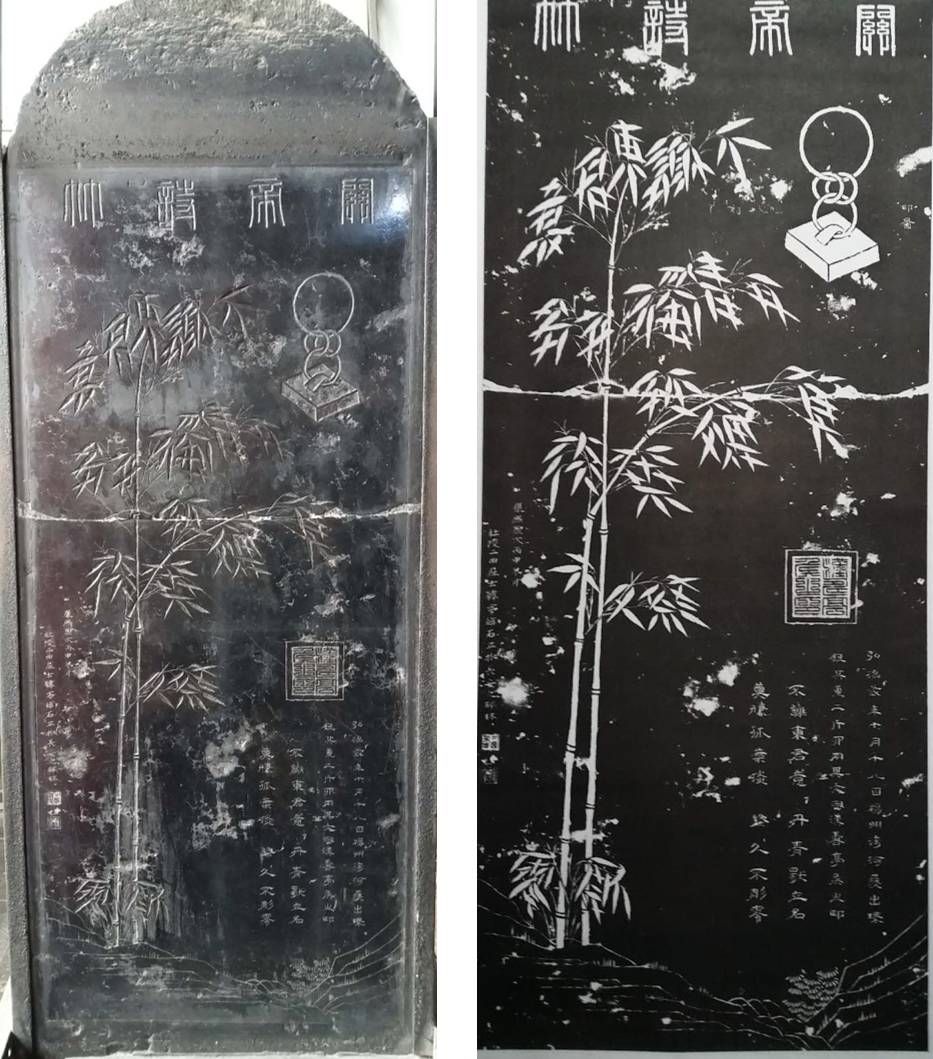 碑林除了有这些很严肃、非常有艺术价值的碑,也有一些小清新。比如这个碑叫《关帝诗竹》,这就是蛮有趣的。据说是明代的时候挖大运河挖出了这个印章,印章上有几个字:汉寿亭侯之印,这是关羽的印,然后说旁边这个竹子是关羽写的四句诗:不谢东君意,丹青独立名;莫嫌孤叶淡,终究不凋零。这个翻刻本极多,改造本也极多,但是我们这是祖本——康熙本。