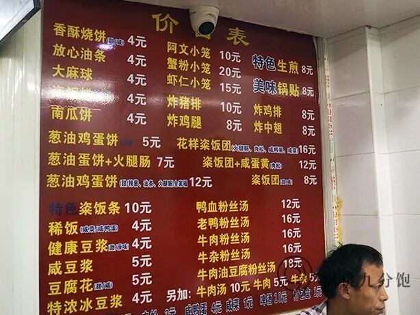 还有菜单,为了让食客保持新鲜感,店里增加了很多菜品。自制鸡蛋饼,有甜辣两种口味,甜酱是店里拿生粉、糖、甜面酱特调的,很有特色。还有独创的粢饭条,相比粢饭糕,炸过后会更焦一点。还有生煎、小笼、炸猪排、粉丝汤……