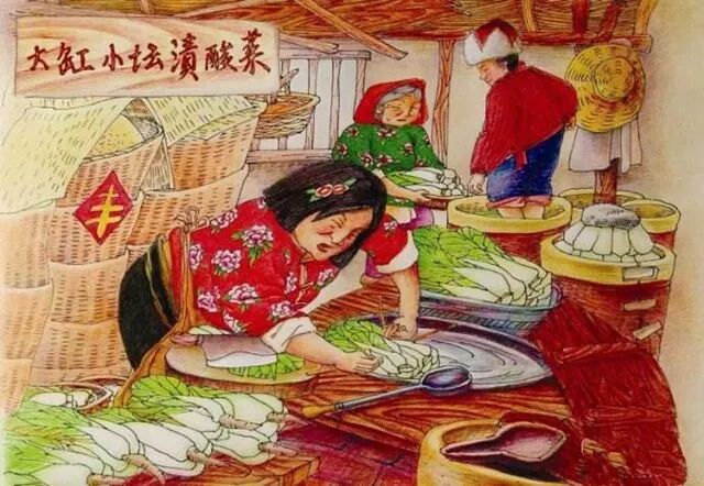 没有菜吃,只能想办法,到了秋天,家家户户都渍酸菜。简单地说,就是把白菜挤压到一个大缸里,用重物压实。里面缺氧,于是厌氧的乳酸菌大量繁殖,把其他的细菌都杀死,由此产生的带乳酸的菜,就叫酸菜。既能让白菜保持一部分原来的养分,同时还有乳酸,富有营养,易于消化。
