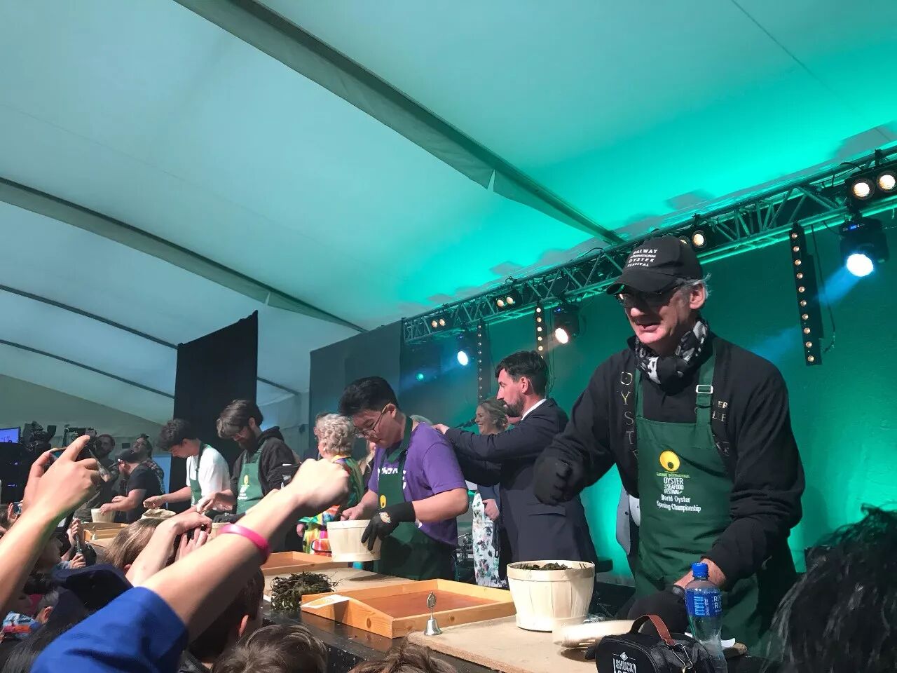 比赛当天的小镇的确是热火朝天。这里不仅有开蚝比赛,还有盛大的美食大趴,假面舞会和家庭狂欢活动。全球的生蚝爱好者济济一堂,大啖香槟、黑啤、海鲜,三天可以消耗300多万只生蚝。Wen告诉我,这一切其实源于63年前的一个小聪明。