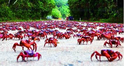 圣诞岛红蟹是生活在东南亚的紫蟹的变种,平均寿命35年。每年的10月底,当热带雨林的大雨来临的时候,红蟹便开始了艰苦的长途跋涉,几百万只红蟹集体大迁徙的场面非常壮观。当地政府为了保护它们,修建了红蟹专用的野生动物通道,甚至在迁徙的高峰时期关闭公路和铁路。