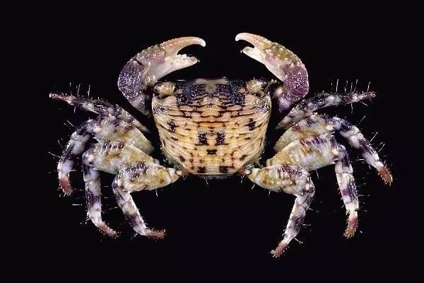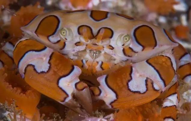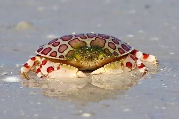 虎斑蟹,栖息于水深30~100米砂底。分布于东京湾以南及印度洋。壳宽约10厘米,表面光滑。壳面和钳脚上有紫色条纹和斑点,是不是很像hello kitty。