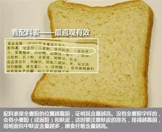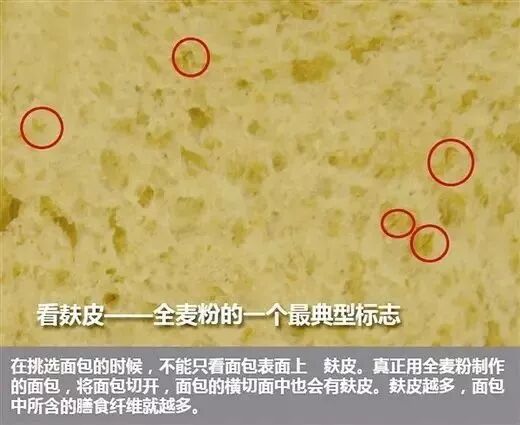 并不是表面上有麸皮的就是全麦面包,全麦面包的内部横断面上也会有很多麸皮,并且麸皮越多,其膳食纤维的含量就越高。还有全麦面包切面更加紧密,不像白面包一样蓬松而存在许多蜂窝状的气孔。所以仔细观察便能辨别一二。